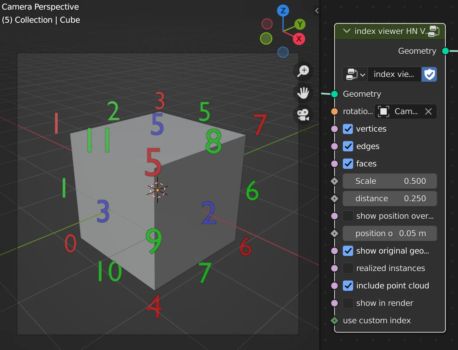 This Geometry Nodes group provides a visual overlay for viewing geometry indices directly in the Blender viewport. It supports displaying indices for vertices, edges, faces, instances, curves, and point clouds. Users can toggle visibility for different geometry components and optionally enable the index display during rendering.
