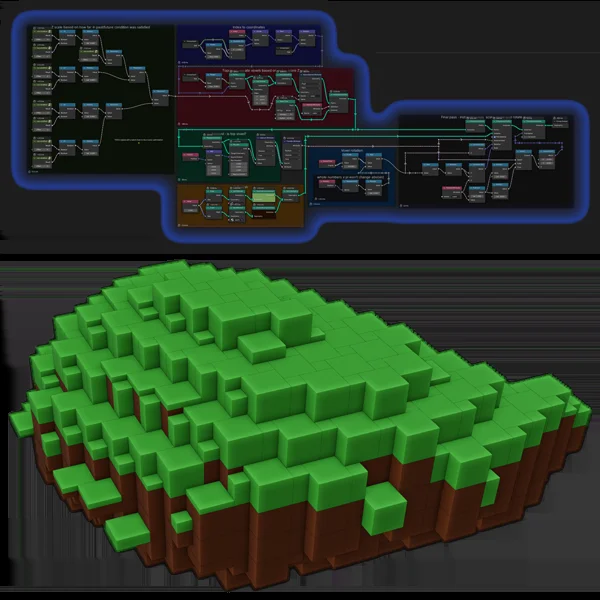 A custom node group evaluates spatial conditions, allowing the voxels to smoothly transition in size. Instead of popping into existence, voxels scale and translate along the Z-axis to create a growing or melting visual effect. The creator explicitly provides this file as an educational resource and notes performance limitations due to its multi-frame noise sampling and complete frustum instancing.