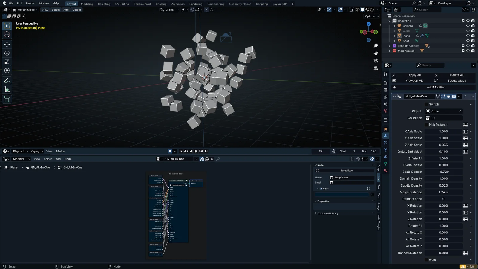 GeoScatterX is a Geometry Nodes modifier designed to manage object scattering and procedural randomization. The tool provides options to control the location, rotation, and X-axis scale of distributed items.