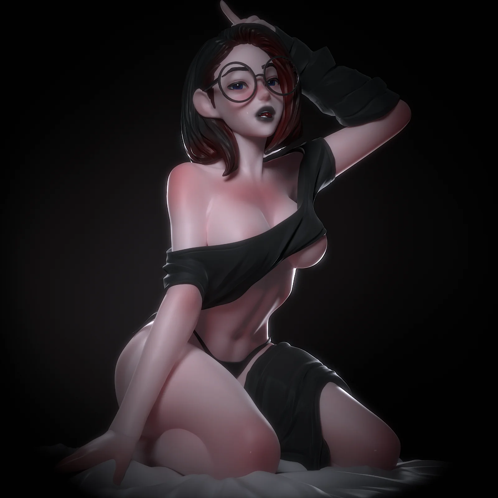 A 3D character model of a female wearing glasses, provided as a complete Blender scene. The model is designed to be used as a reference for studying human anatomy and character posing.
