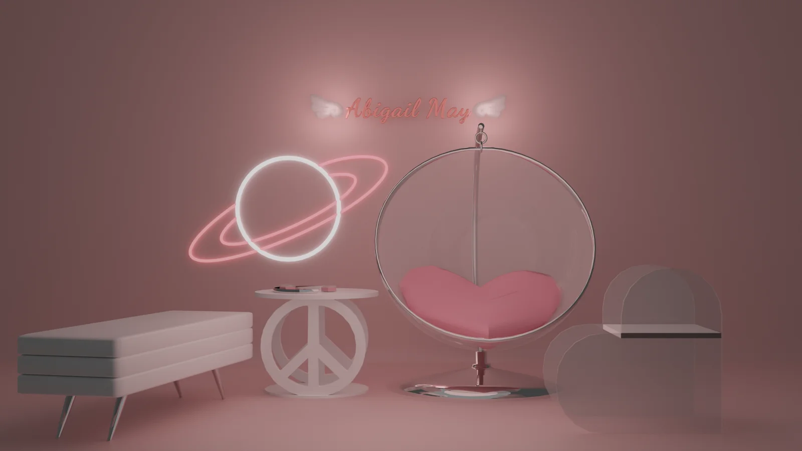 A collection of Y2K-inspired 3D props designed for virtual environments and real-time applications. The pack features a variety of furniture and decorative items, including a bench, a globe chair with a pillow, sets of heart-shaped candles, and themed tables. Each asset is modeled with real-time performance in mind, offering low triangle counts suitable for interactive use.
