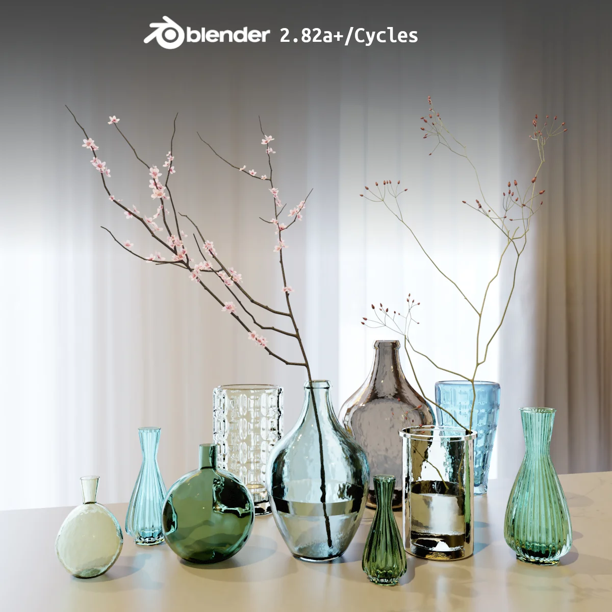 This collection contains 3D models of glass vases and flowers. The files include accompanying textures, shader setups, and lighting configurations. The assets are fully prepared for rendering with the Cycles engine.