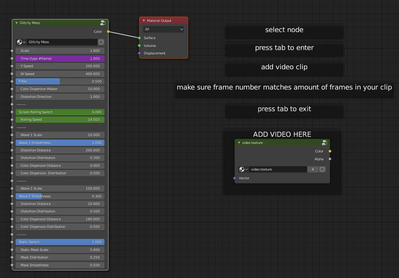 This setup applies a visual glitch effect to finished renders directly within Blender. It functions as a post-processing tool built entirely within the Shader Editor, utilizing viewport compositing techniques rather than relying on Blender's standard Compositor node tree.