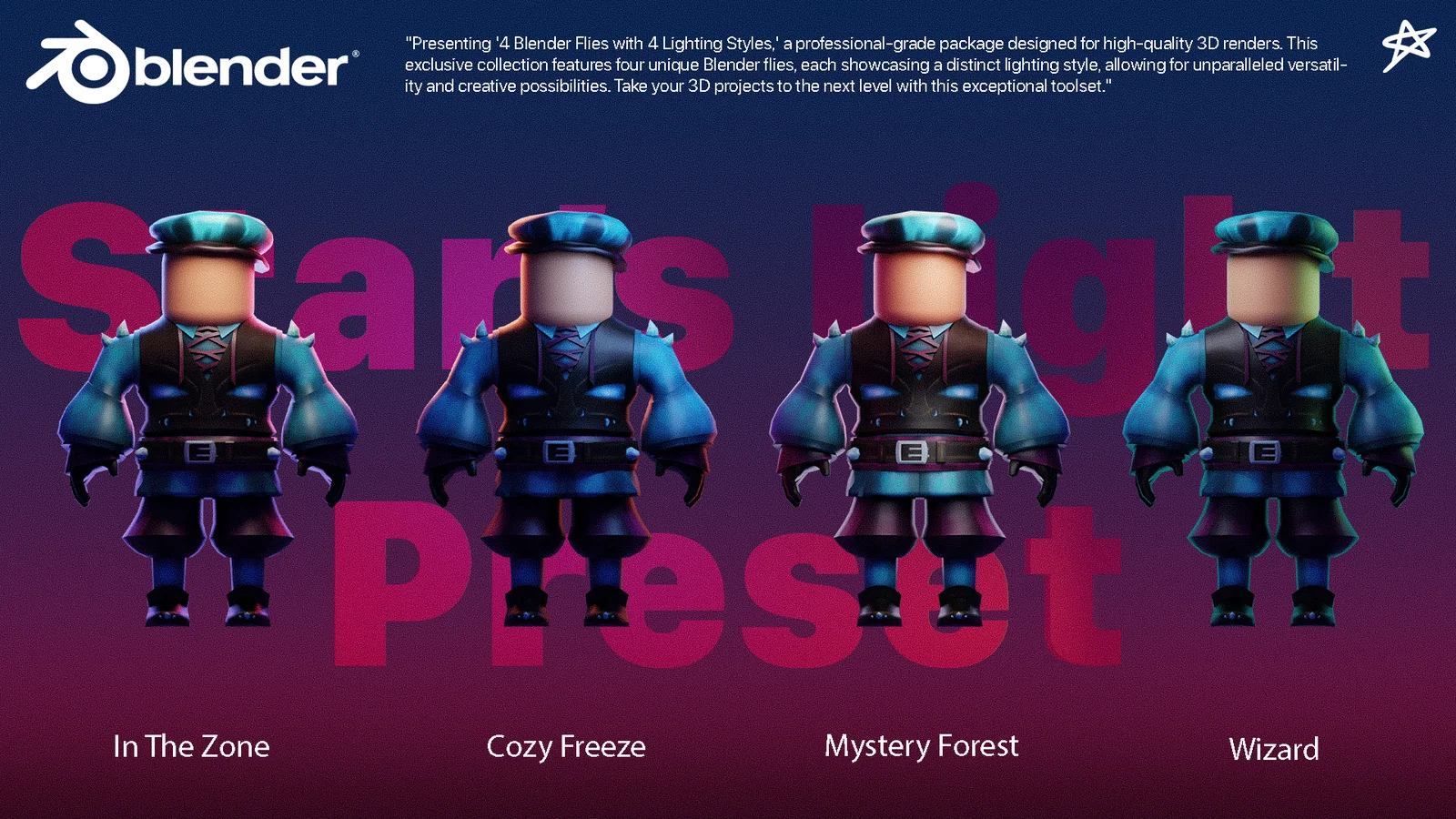 This package provides 12 Blender files containing professional lighting presets designed to enhance 3D environments and subjects. Alongside the lighting setups, the collection includes specific shader settings configured to complement the illumination rigs. These pre-built files serve as ready-to-use templates to streamline the scene lighting process.