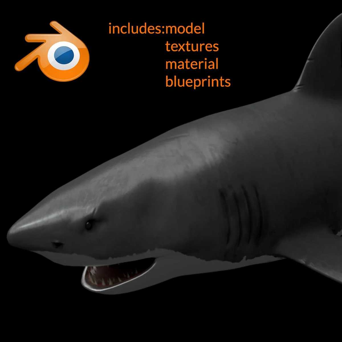 A 3D model of a great white shark provided as a Blender scene file. The model includes its associated textures, which are packed directly into the .blend file for immediate use. The download also contains the original blueprint reference images utilized during the modeling process.