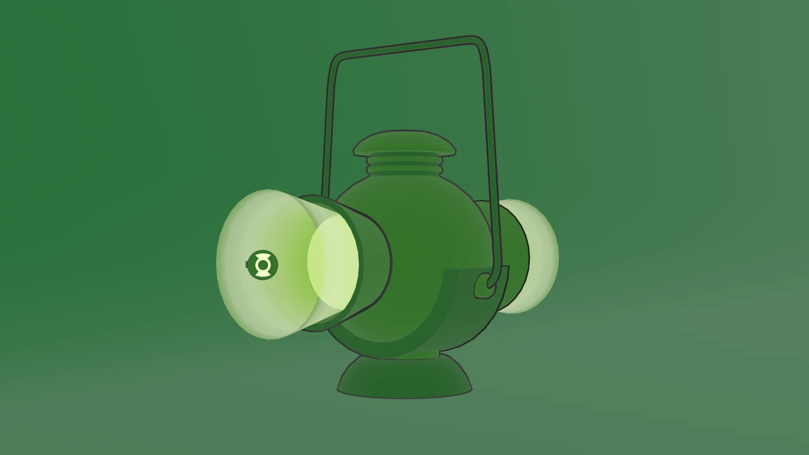 This asset includes 3D models of the Green Lantern power ring and its corresponding power battery. The models are designed with a stylized cartoon aesthetic, featuring bright colors and distinct visual outlines.
