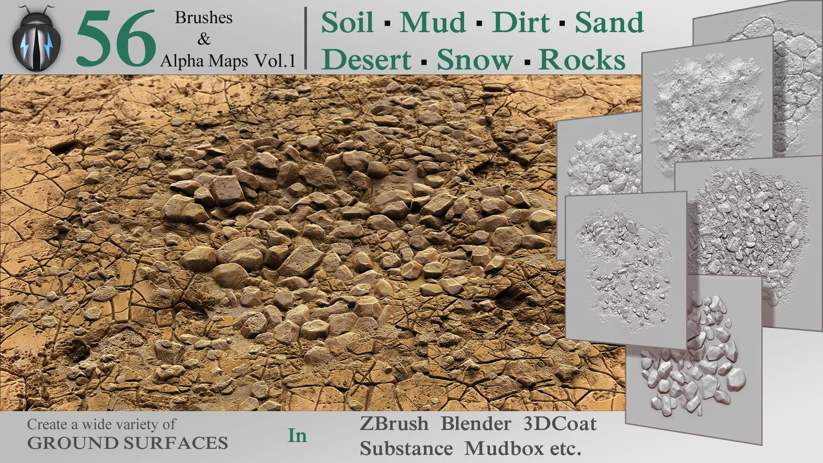 This collection provides 56 high-resolution alpha maps designed for sculpting ground and terrain surfaces. The included maps cover a variety of environments, including rock, sand dunes, mountain craters, mud, snow, dirt, and cracked concrete or stone. The assets are provided in 4K resolution across JPEG, PSD, TIFF, and PNG formats, allowing them to be used as sculpt alphas or texture elements.