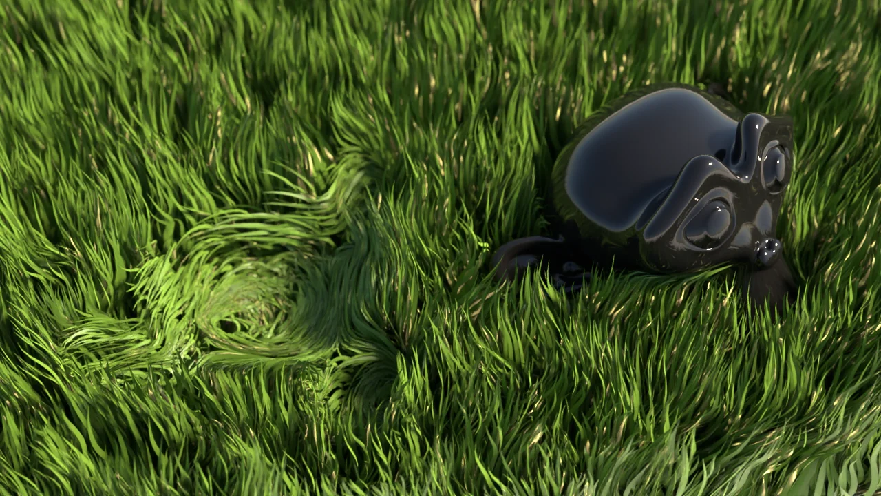 This geometry node setup uses simulation nodes to animate the growth of grass across surfaces in Blender. The tool allows grass to naturally grow around scene obstacles and includes controls for growth speed, random length variation, and blade thickness.