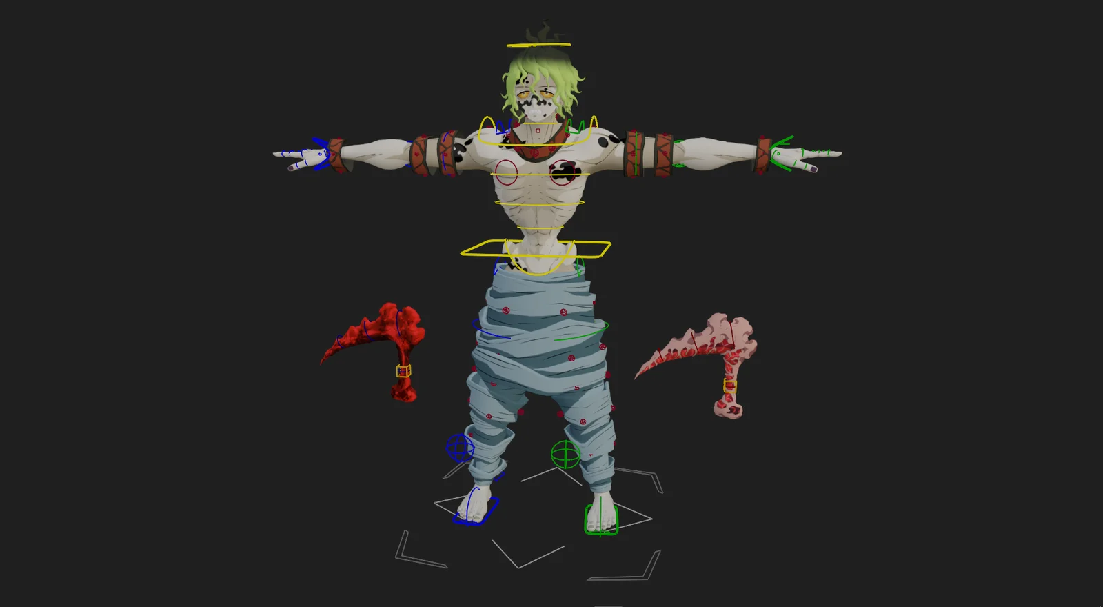 A rigged 3D character model of Gyutaro configured for Blender 4.3. The armature is recommended to be used in conjunction with the rig_tools add-on for optimal performance. The base mesh is originally from CyberConnect2 and SEGA, and the file is provided strictly for personal, non-profit use.