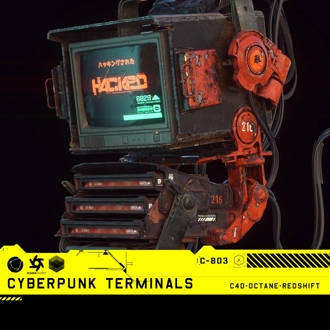 A game-ready 3D model of a hacker terminal designed for AV/AR projects. The asset includes a full set of 4K PBR textures, providing color, ambient occlusion, roughness, metalness, normal, and displacement maps for realistic surface detailing. It is provided in 3DS format for general 3D application import, alongside Cinema 4D files specifically pre-configured for Redshift and Octane render engines.