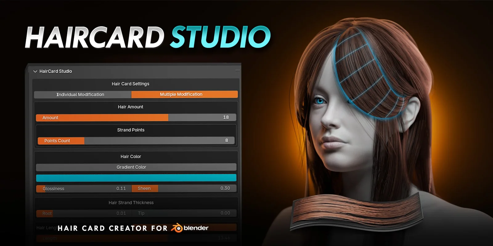 Hair Card Studio is an add-on for generating and customizing hair cards directly within Blender. It provides a dedicated interface to adjust various strand properties, including thickness, length, spread, and clumping at both the root and tip. Users can dial in specific styles by modifying frizz, curl, roughness, and hairline shape parameters. The tool also includes material controls for applying solid or root-to-tip gradient colors, along with glossiness and sheen adjustments. Built-in lighting parameters and resolution-based render presets allow users to quickly output hair cards with transparent backgrounds.