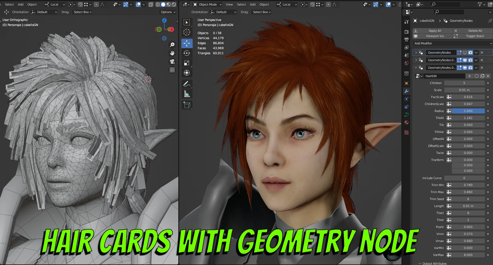 This Geometry Nodes system generates hair cards using input curve guides. The setup creates child curves clustered around parent guides, giving users control over the orientation and growth patterns of the generated strands. It includes randomized parameters for card generation and features editable UV mapping for each individual hair card.