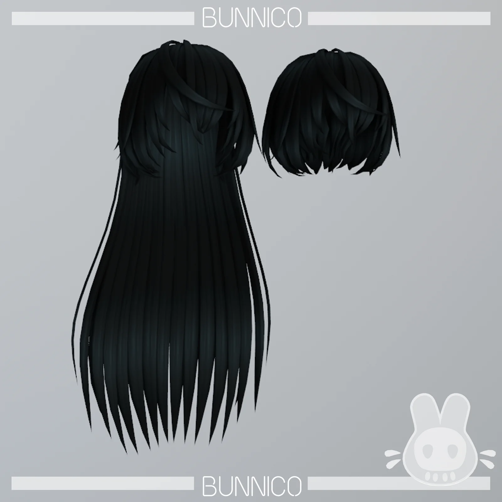 A collection of four rigged and weighted 3D hair models for character creation. The pack includes long center bang hair, short center bang hair, long hair, and a low bun hairstyle. Polygon counts range from 20,000 to 46,000. All models are UV mapped to support standard flat hair textures.