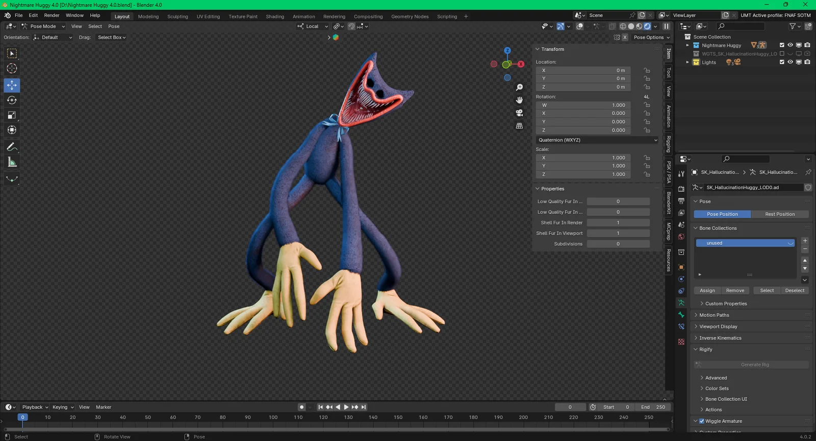 A rigged 3D character model of Hallucination Huggy, extracted from the game Poppy Playtime Chapter 3. The provided rig includes custom properties located on the gear bone, which allow users to toggle between different types of fur and control their visibility in final renders.