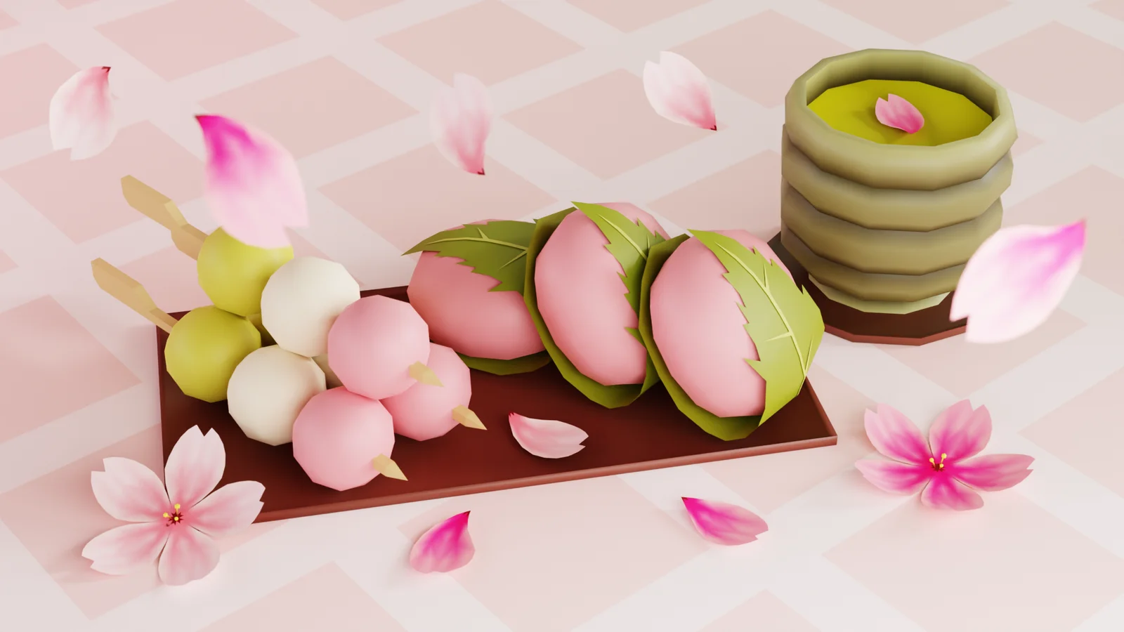 This asset pack contains a collection of spring festival-themed 3D models. The set includes a hanami dango, sakura mochi, a matcha tea cup, two colored sakura flowers, and eight individual sakura petals. The package provides four texture files and features geometry variations for both smooth-shaded and flat-shaded visual styles.