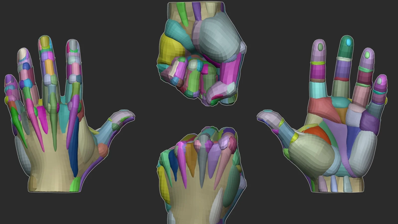 The geometry details the specific soft-tissue and fat pad volumes that give hands their fleshy appearance, alongside structural transitions demonstrating how skin wraps between hard bone and soft tissue. The package also includes an additional fist blockout constructed from the same objects, illustrating how the anatomical structure behaves under compression. The model is provided in Blend, ZTL, FBX, and OBJ formats.