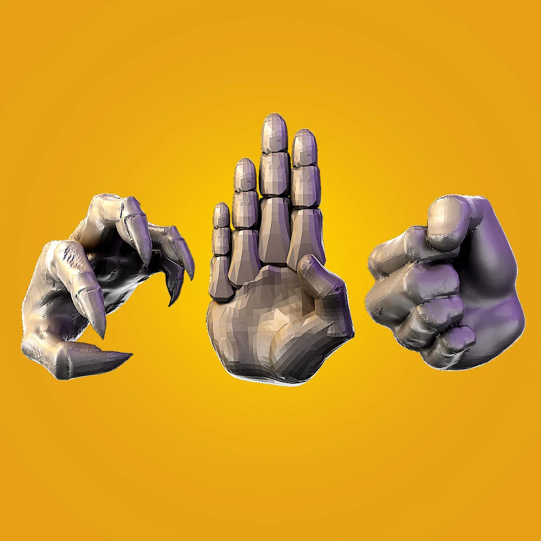 A posable hand basemesh designed as a starting point for sculpting characters and miniature projects. The rigged model allows users to establish hand poses quickly before proceeding with detailed sculpting workflows.