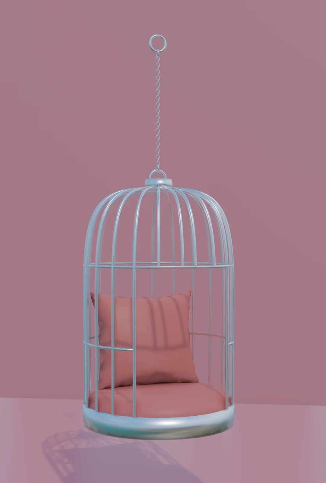 A 3D model of a hanging cage chair and an accompanying pillow. The chair geometry consists of approximately 16,298 triangles, while the pillow contains 582 triangles.