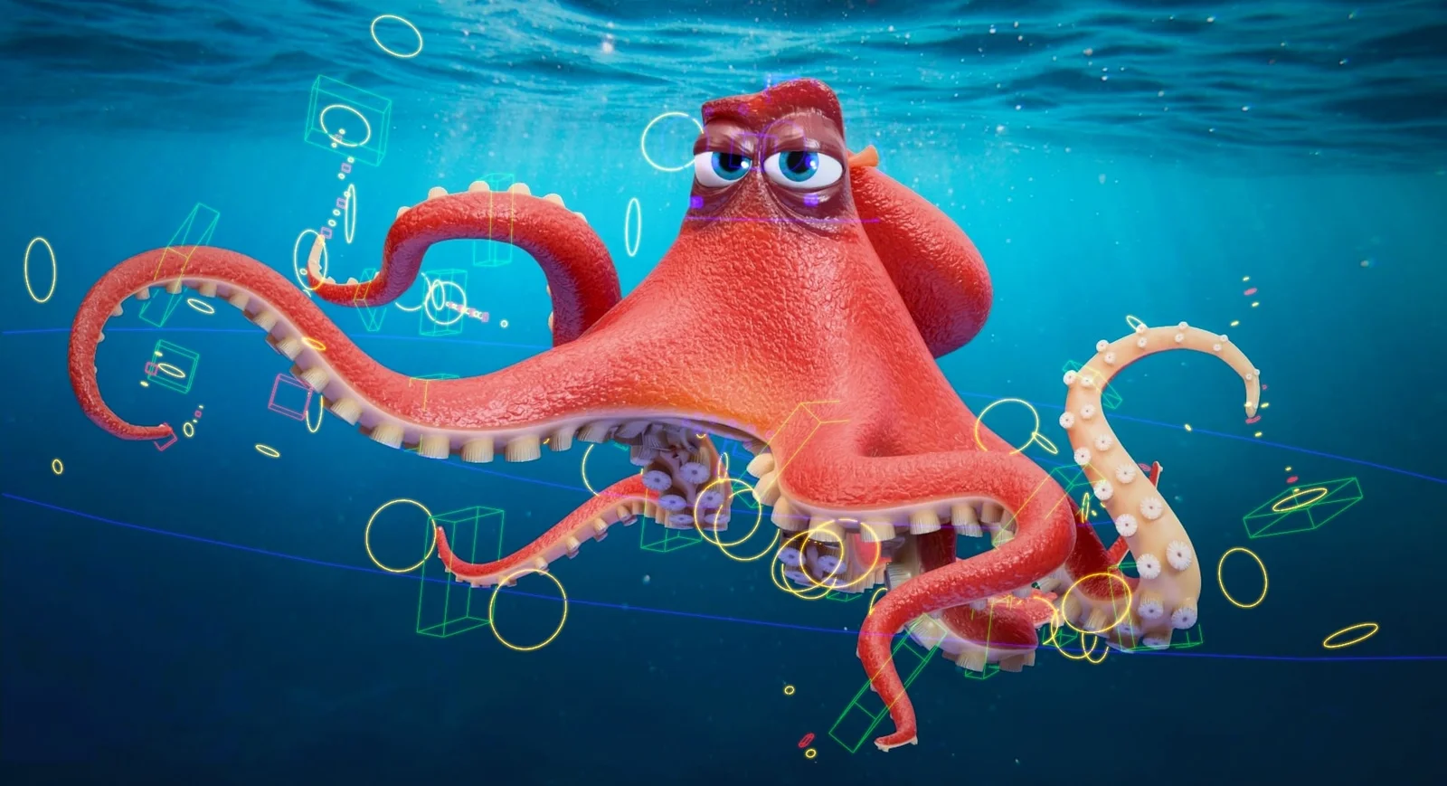 This is a rigged 3D character model of a septopus, based on the design of Hank from Pixar's Finding Dory. The rig is driven primarily by B-bones and bezier curves, allowing for complex tentacle posing and flexible squashing movements. The provided blend file includes the character geometry, armature rig, and packed textures, and is configured for both the Cycles and EEVEE render engines.