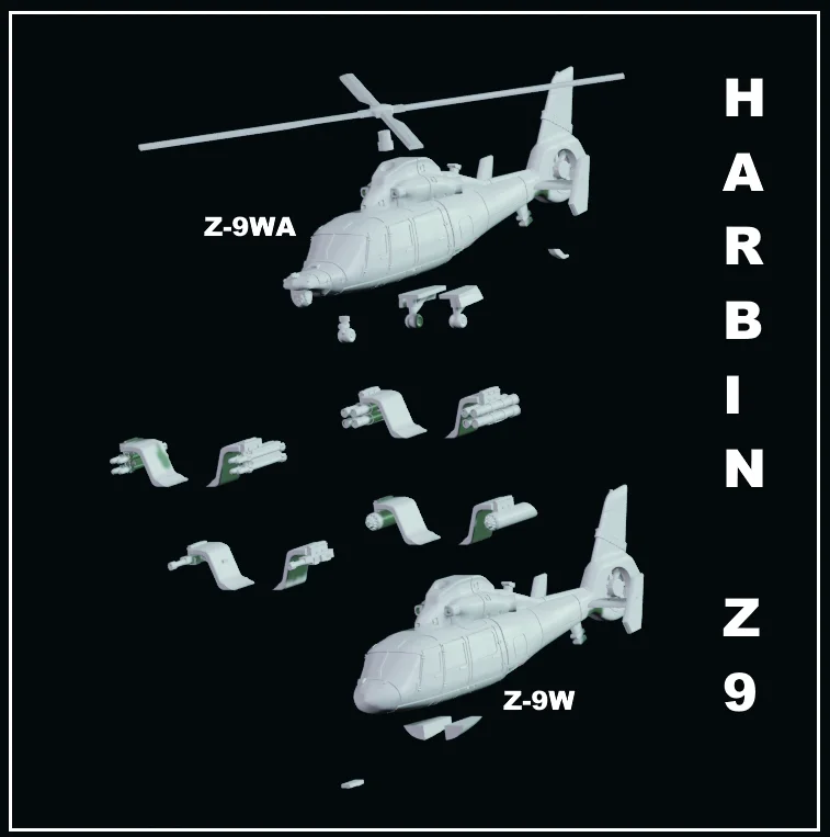 This collection provides 3D printable models of the Harbin Z-9W and Z-9WA helicopters, also known as the Eurocopter AS565 Panther. Designed at a 1/100 scale for 15mm tabletop setups, the set includes the main vehicle variants alongside attachable accessories like 57mm rockets, a 23mm cannon, and HJ8 and TY90 missiles. Two dismounted pilot figures are also included. Presupported files are provided alongside the standard models.