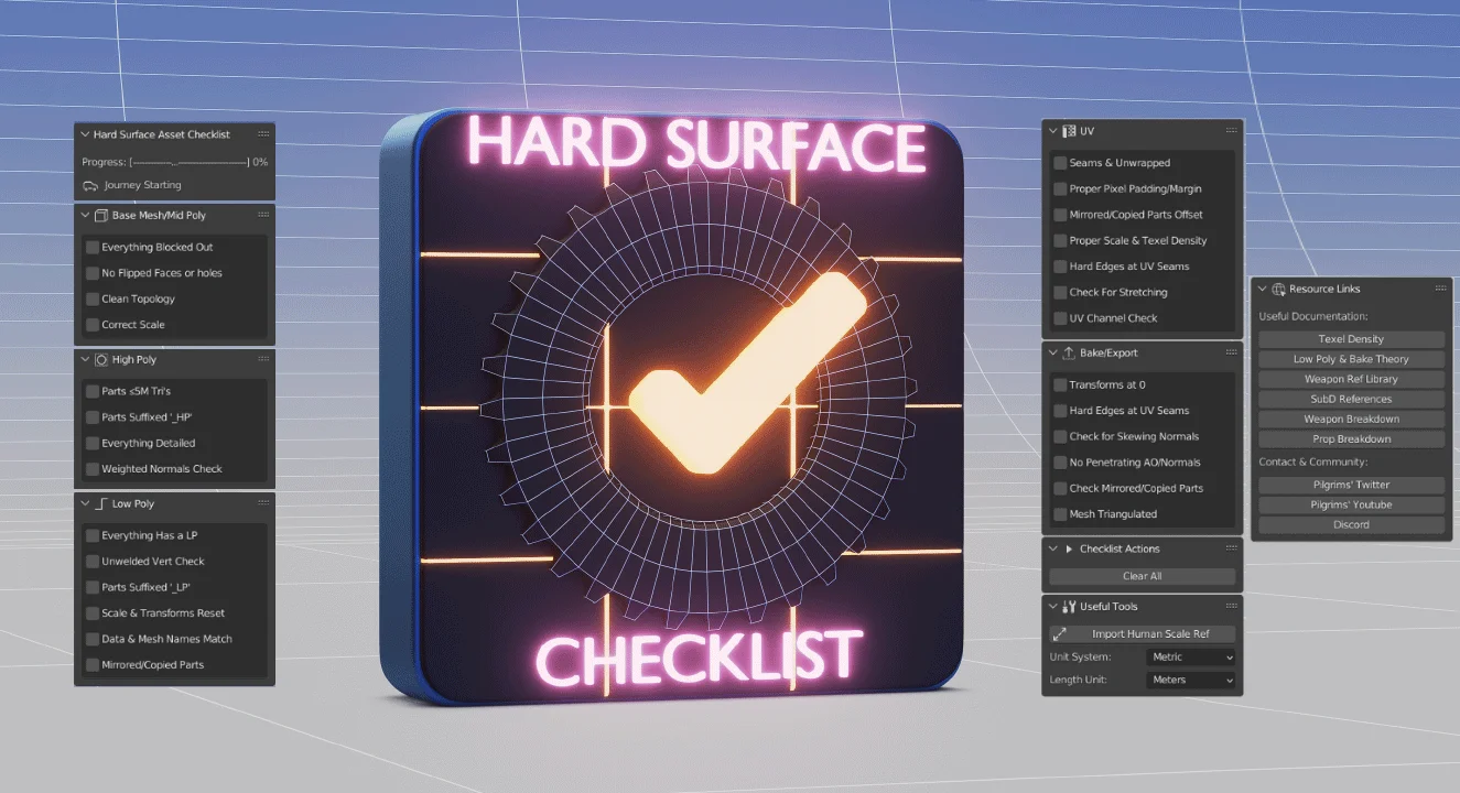 Hard Surface Asset Checklist provides an integrated workflow checklist designed for the modeling stages of hard surface asset creation. It includes steps for various stages of modeling, excluding texturing, and features tooltips explaining each checklist item.