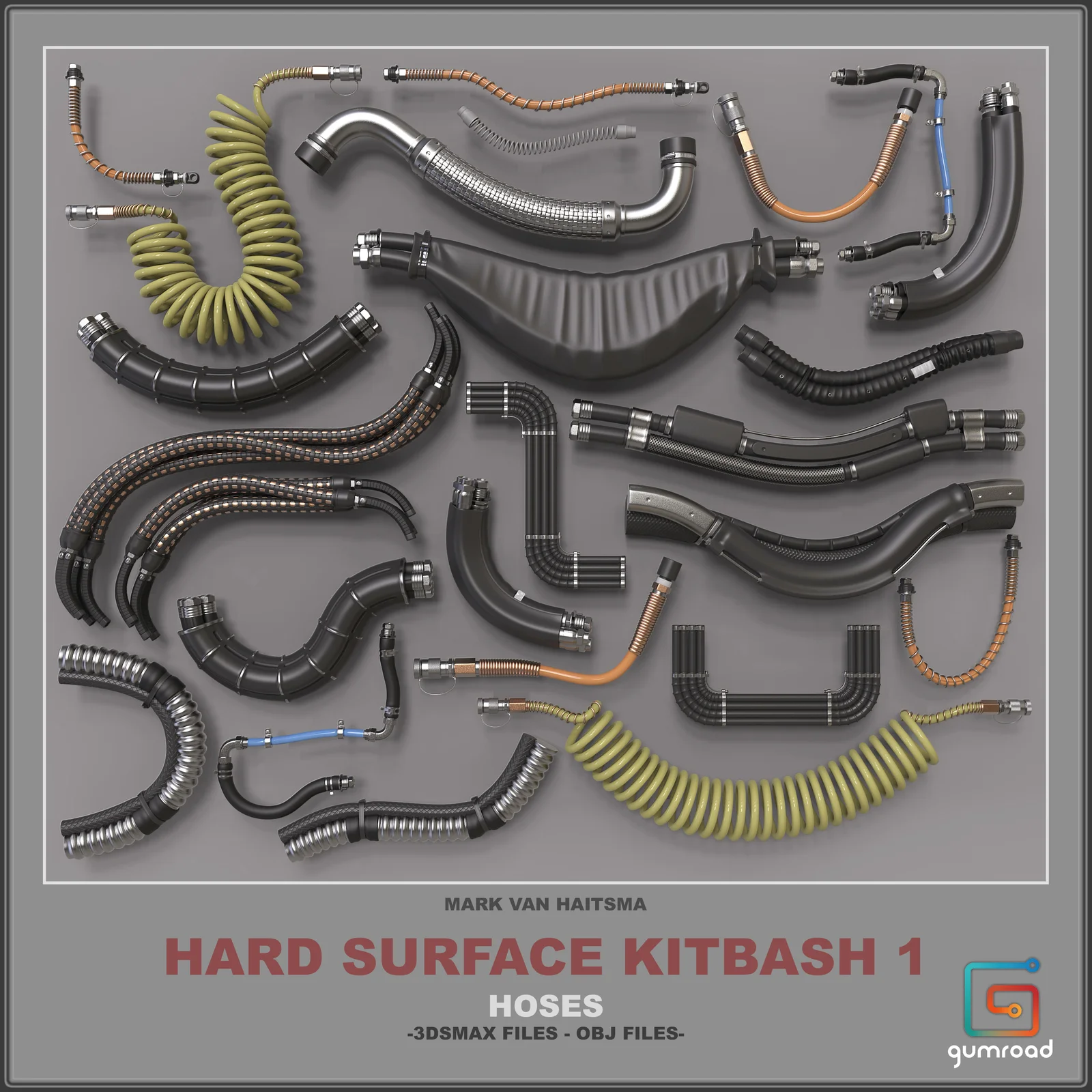 A collection of over 55 high-poly hose models designed for hard surface kitbashing and conceptual design. The meshes are prepared with basic material separations and named appropriately for easy integration. They do not include UV mapping.