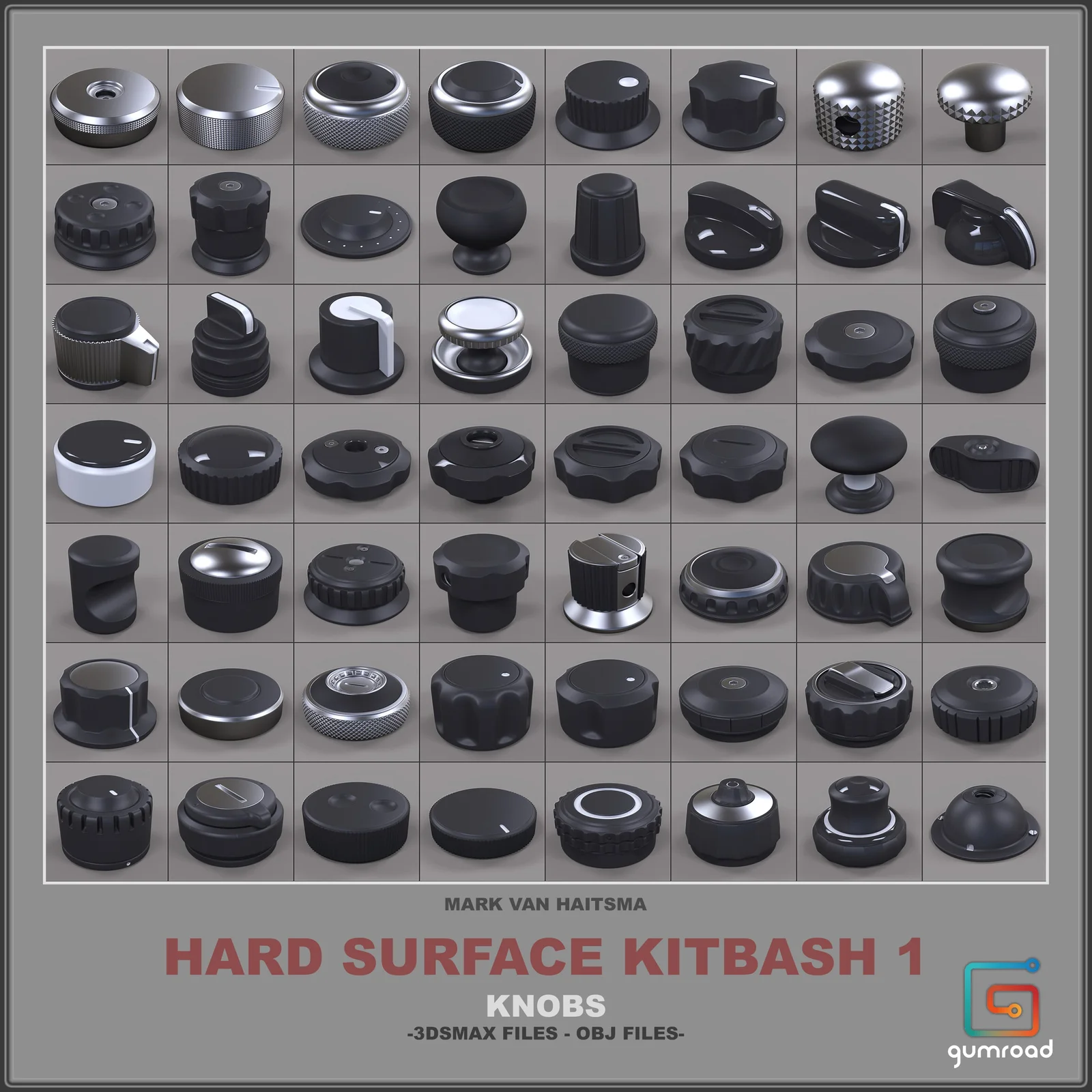 This kitbash library contains 75 high-poly knob models designed for detailing hard surface concepts and mechanical assets. The meshes are provided without UV mapping but include basic material separations. The collection is organized with appropriately named meshes and includes individual JPEG thumbnails for easy reference when selecting pieces. The items are supplied in OBJ format without smoothing applied, making them suitable for ready import into Blender or other 3D applications.