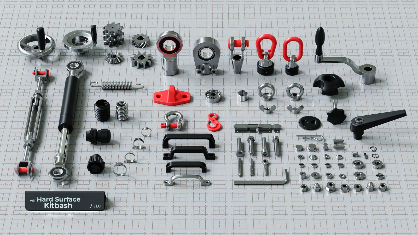 A collection of over 80 mechanical component 3D models designed to adhere to real-world engineering regulations, such as DIN and ISO standards. The pack focuses on realistic, contemporary hardware over fictional sci-fi concepts, maintaining accurate measurements, scale, and proportions for specific parts like standard Allen screws.