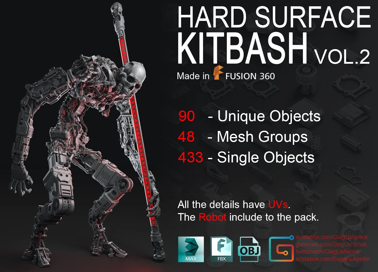This 3D kitbash collection contains 90 unique hard surface objects and 48 mesh groups, totaling 433 individual piece models. The assets are designed with non-subdivisional geometry and include initial UV mapping. A complete pre-assembled robot model is also provided within the package.