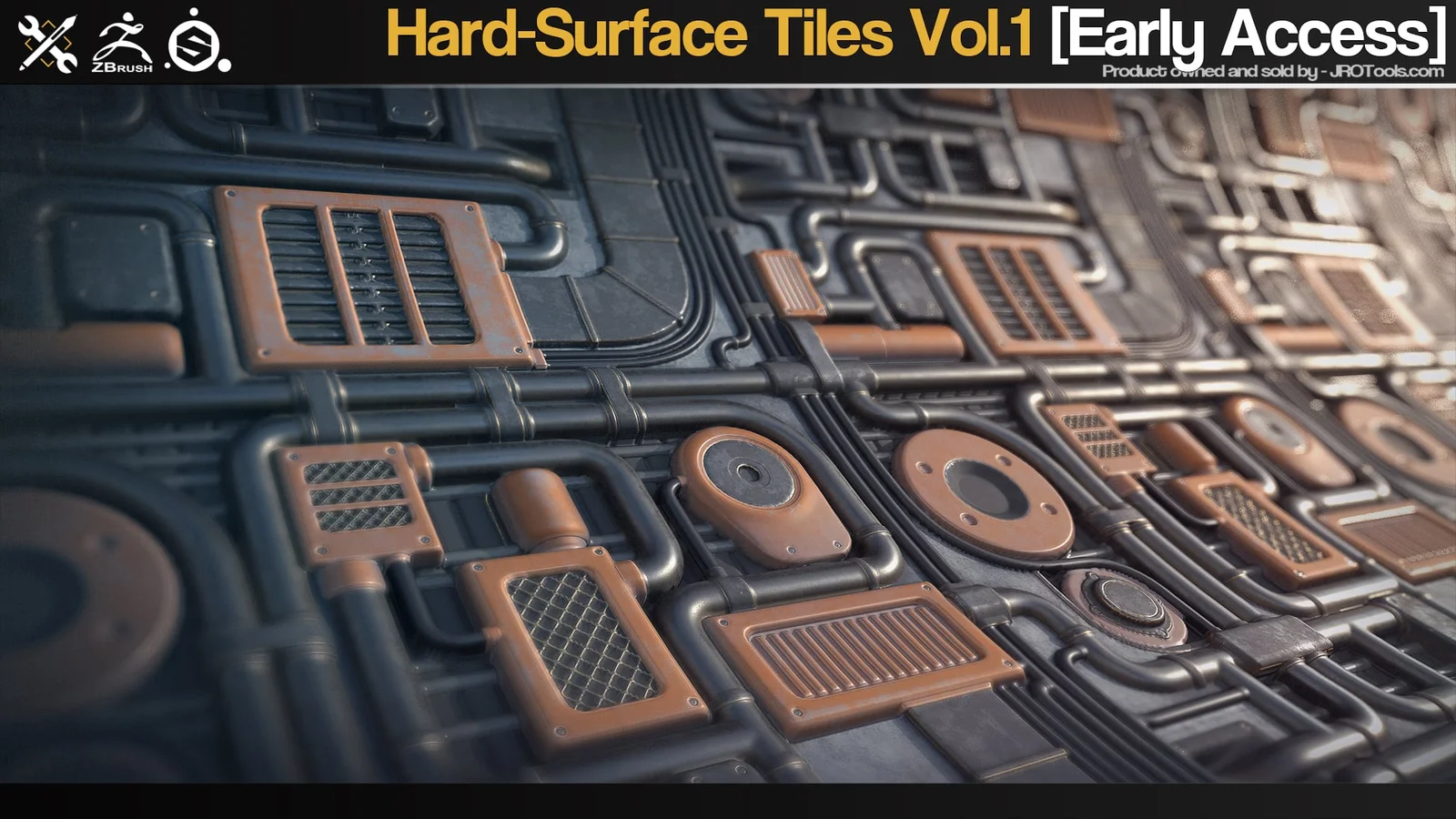 A collection of hard-surface height tiles designed for adding mechanical details and paneling to 3D models. The pack provides over 100 tiles at 4096 x 4096 resolution in 16-bit depth.