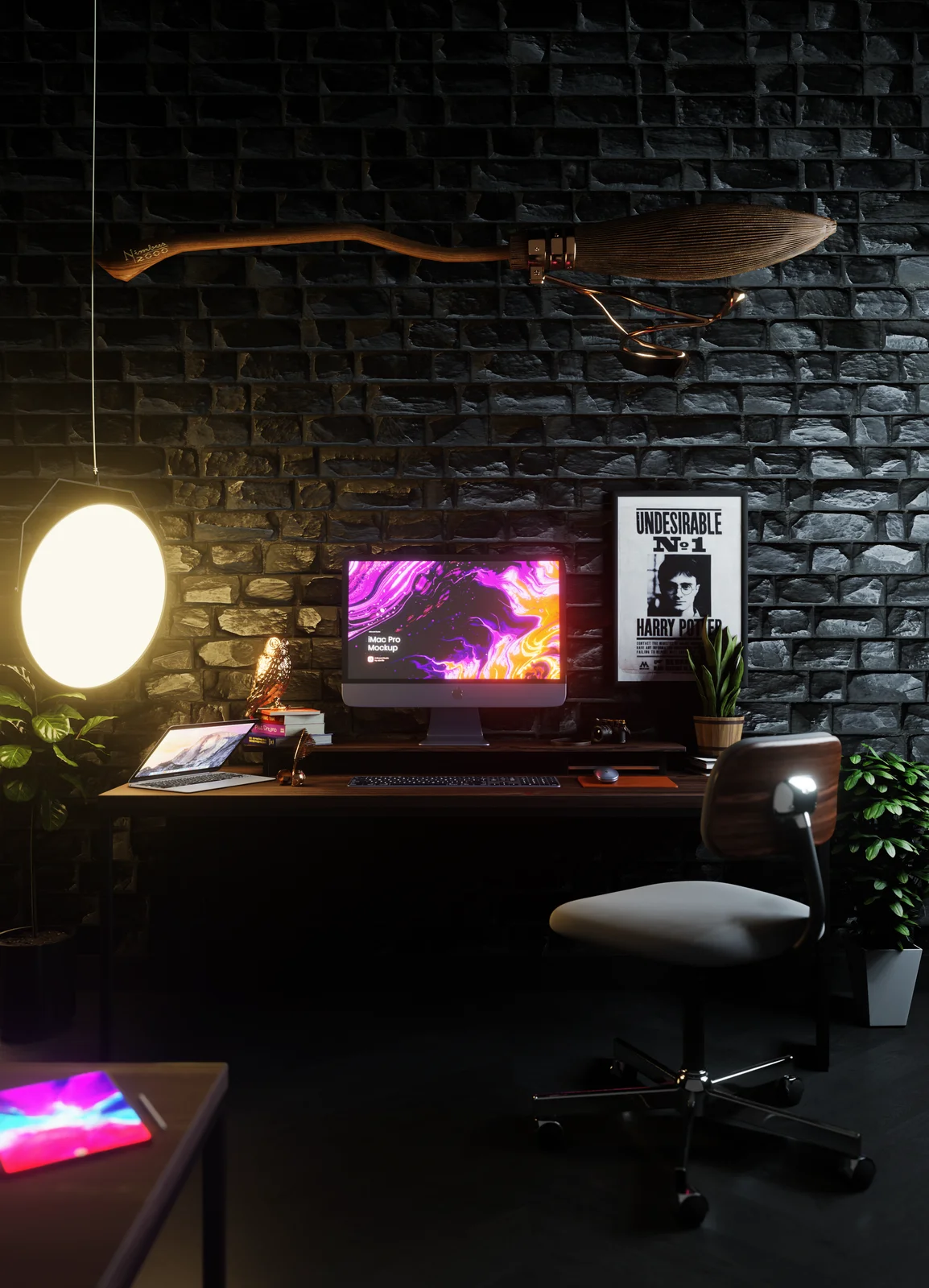 This product is a detailed 3D model of a modern living room and workspace inspired by Harry Potter. The scene includes high-resolution textures suitable for close-up renderings. It comes with a lighting setup ready for rendering in Eevee, featuring both day and night lighting options. File formats provided are OBJ and the native blend file.