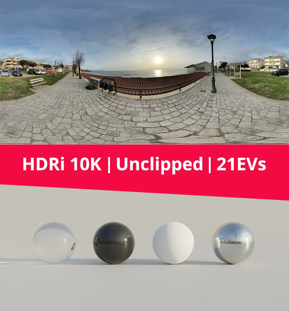 This product provides an equirectangular HDRI capturing a beachfront setting at sunset. It features an unclipped 21 EV dynamic range, ensuring the full brightness of the sun is maintained for realistic exterior lighting. The environment map is supplied in the .hdr format and includes multiple resolutions ranging from 1K up to 10K to accommodate different background and reflection requirements.