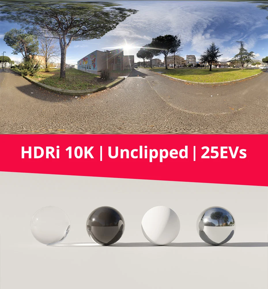 An equirectangular HDR image for illuminating 3D scenes and providing environment backgrounds. This unclipped environment map captures 25 EVs of dynamic range, retaining the full brightness values of the sun to produce realistic light and shadow. The files are supplied in a 32-bit format and include resolutions ranging from 1K up to a maximum of 10K (10000x5000 pixels) for crisp reflections.