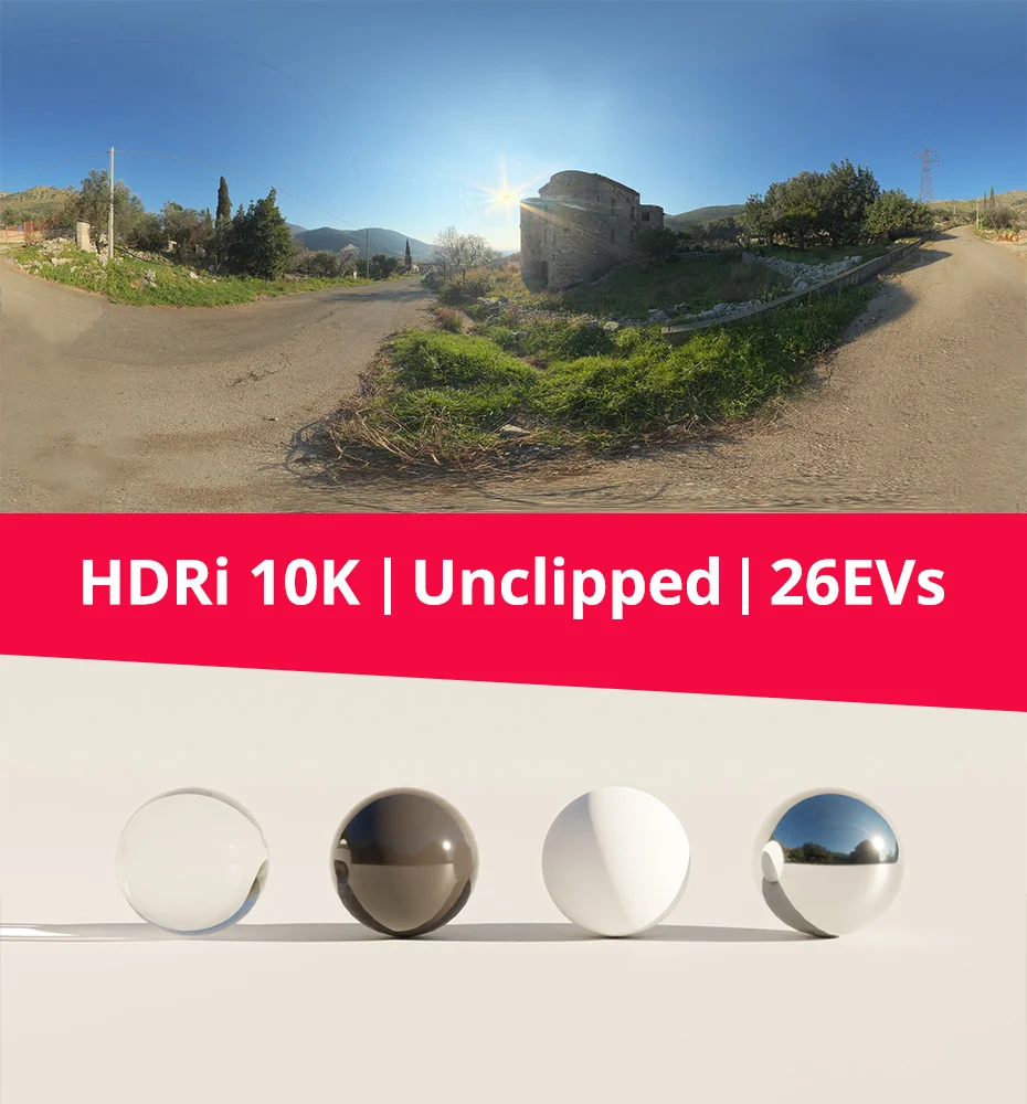 This equirectangular HDRI provides environment lighting and reflections for 3D scenes. The unclipped format captures a full 26 EVs of dynamic range, preserving the maximum brightness of the sun to produce accurate, high-contrast lighting without clamping. The package includes the .hdr file in multiple resolutions, ranging from 1K up to a maximum of 10K (10000x5000 pixels).