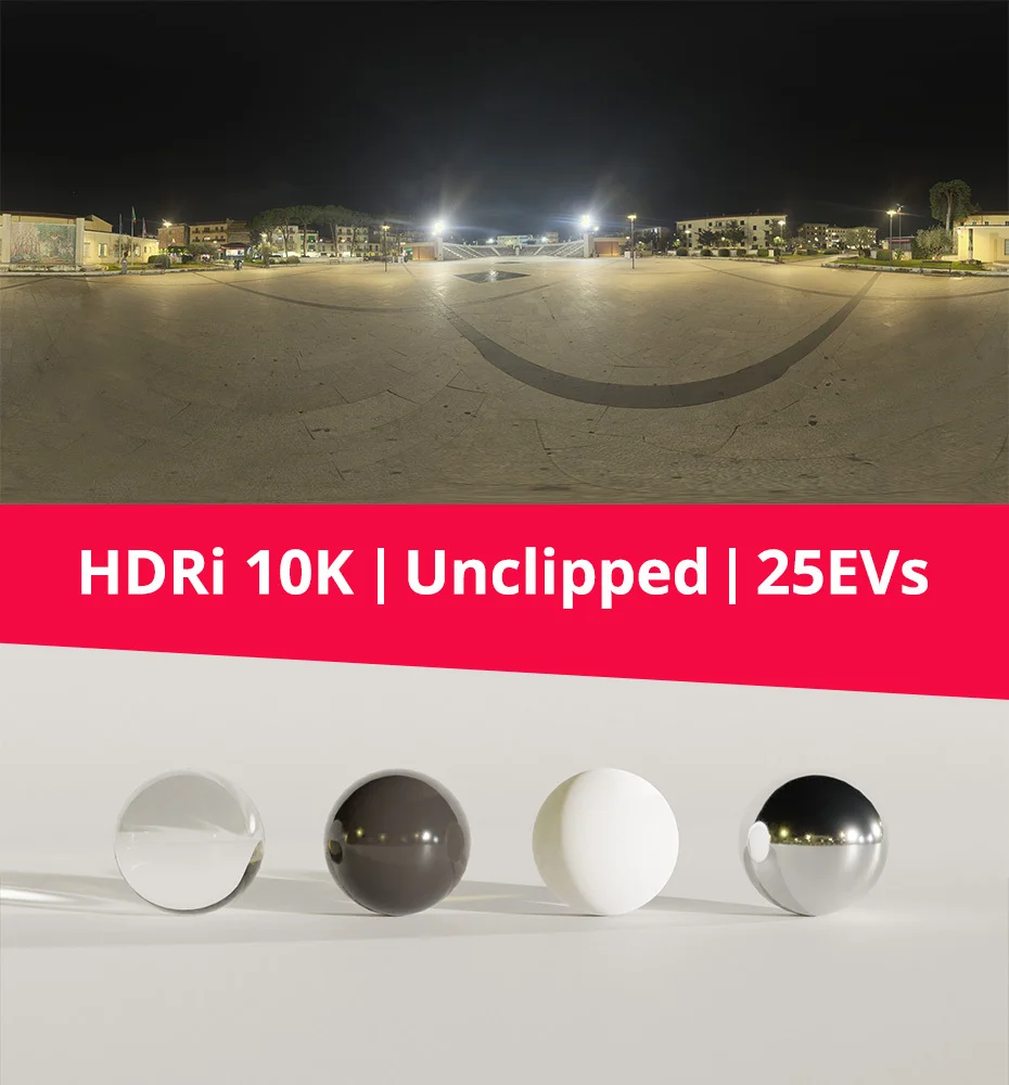This product provides an equirectangular night square HDRI in .hdr format for 3D environment lighting. It features an unclipped 32 EV dynamic range to capture the full brightness of the light sources for realistic illumination. The image is available in multiple resolutions up to 10K (10000x5000px) to support clear background rendering and detailed reflections.