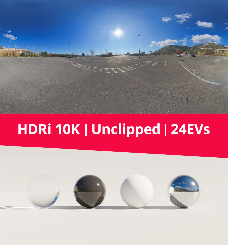 An equirectangular HDRi environment map featuring a parking area surrounded by mountains under a sunny sky. This unclipped high dynamic range image provides 24 EVs to produce realistic ambient lighting, strong sun shadows, and accurate reflections. The environment map is provided in the standard .hdr format and includes multiple resolutions ranging from 1K up to 10K.