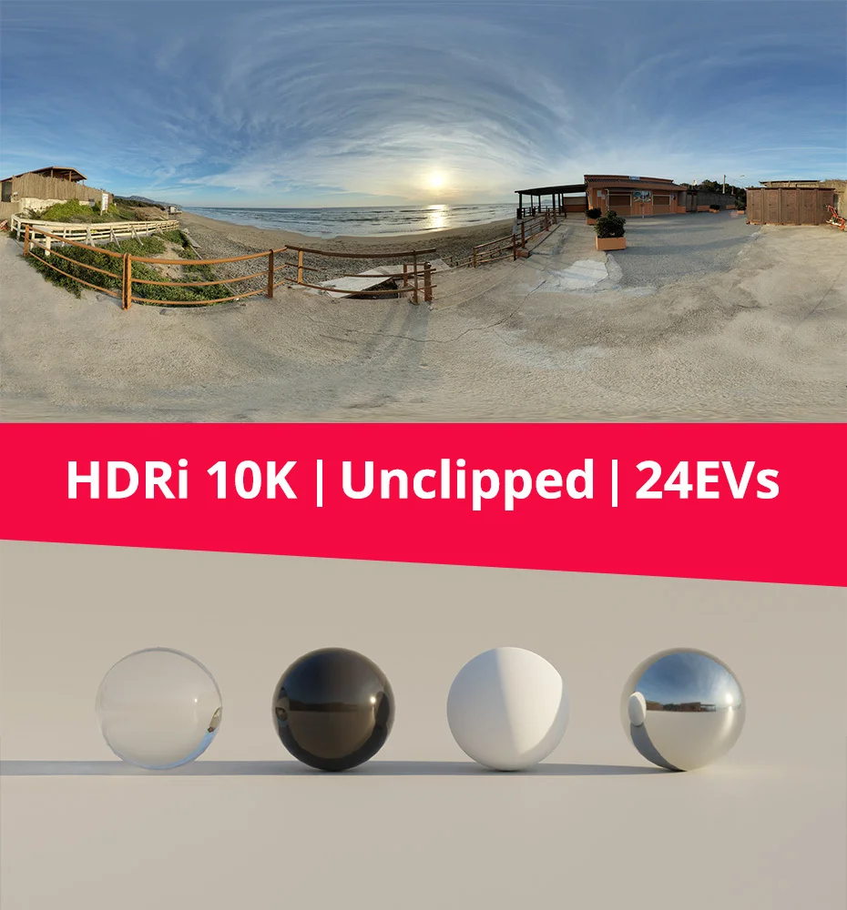 This is an equirectangular HDRI map featuring a sea and sunset environment, provided in .hdr format. The image is unclipped, retaining the full brightness range of the sun with 24 exposure values (EV) to produce realistic lighting and accurate contrast in 3D scenes. The environment map is available in multiple resolutions up to 10K (10000x5000 pixels) to support high-quality reflections and clear background rendering.