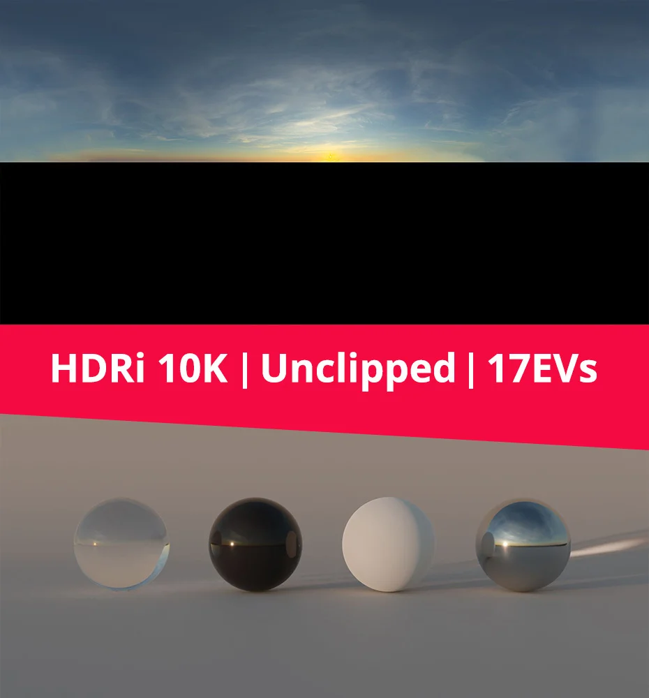 An unclipped high dynamic range image designed for image-based lighting in 3D scenes. The unclipped exposure accurately captures the full brightness of the sun with a dynamic range of 17 EVs, producing realistic lighting and contrast. The environment map is provided in the standard .hdr format at multiple resolutions, including 1K, 3K, 6K, and a maximum 10K resolution designed for sharp background details and precise reflections.