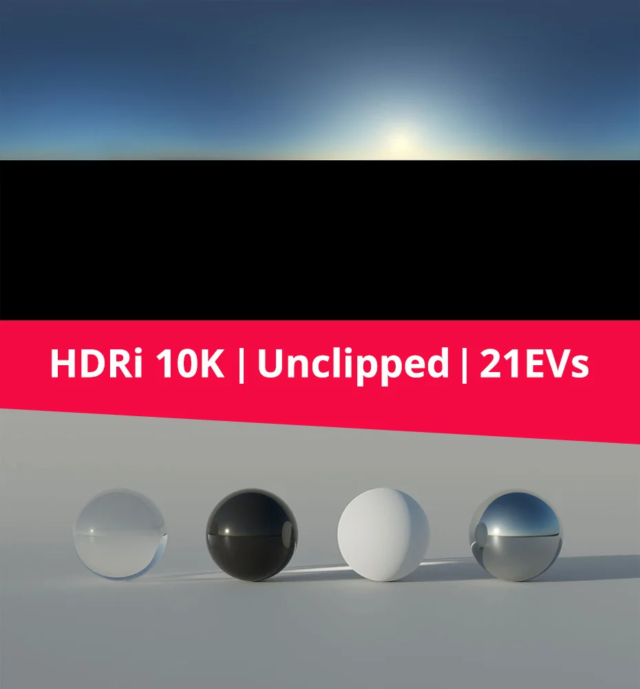 This product provides an unclipped high dynamic range image (HDRI) environment map of a sky, designed to provide realistic image-based lighting for 3D scenes. The map has a dynamic range of 21 exposure values (EVs), capturing the full brightness range, including the sun, to ensure high-contrast and accurate lighting calculations.
