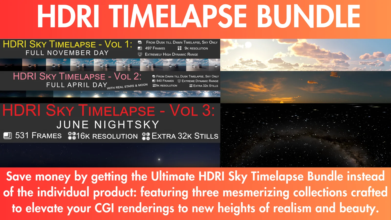 This bundle includes three distinct high dynamic range sky timelapse sequences designed to provide animated environmental lighting for 3D scenes. The collections comprise high-resolution 32-bit EXR image sequences utilizing DWAB compression for efficient loading and playback.