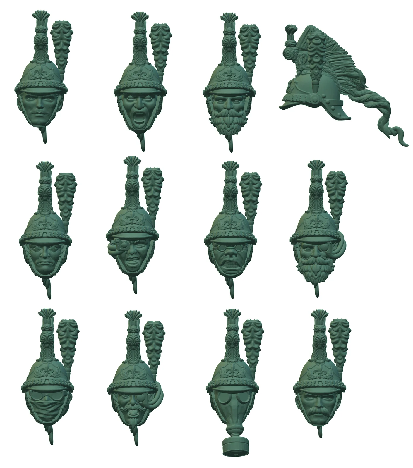 A collection of 3D printable head and hat replacements designed for sci-fi tabletop miniatures. The set includes over 90 pieces, featuring a variety of historical military styles adapted for futuristic settings, such as Czapka caps, Elite Bearskins, Cuirassier helmets, Hussar Busbys, Shako hats, and Bicorns. It also provides specialized heads for Ogre squads and mortar teams, alongside standalone hats and uniform ornaments. The files are supplied in both pre-supported and unsupported formats for 3D printing workflows.