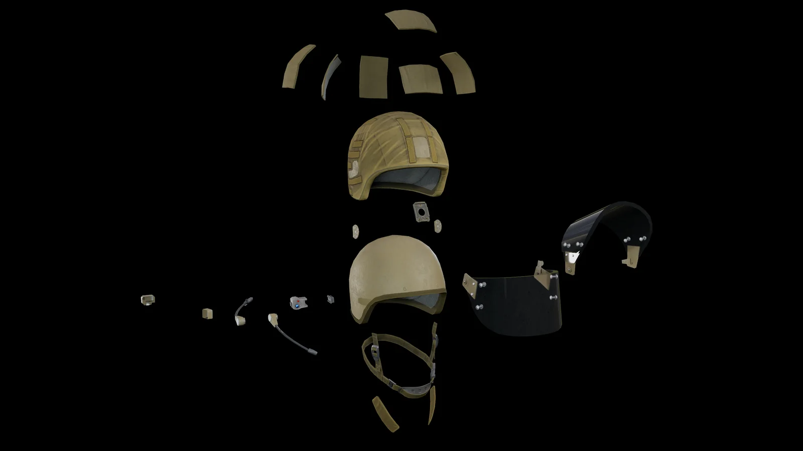 This is a low-poly, modular 3D model of the ZSh-1-2 protective helmet, real-world headgear adopted by the Russian MVD in 2007 as a replacement for the Maska-1. The model is optimized for game engines and real-time rendering, featuring 2,784 vertices and 4,946 triangles.