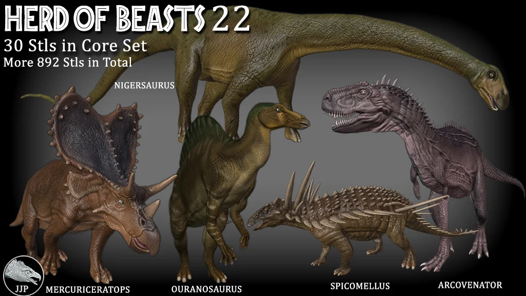 This collection contains 36 high-resolution dinosaur miniature models designed for 3D printing. The creatures are modeled at a standard 32mm tabletop scale and base their physical features on current paleontological research and identified fossil remains.