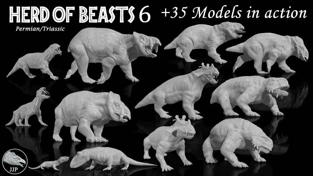 A collection of 35 prehistoric beast miniatures designed for 3D printing at a 32mm scale. The models are based on paleontological studies and fossil remains. The pack includes species like Tiarajudens, Lisowicia, Scutosaurus, Placerias, Estemmenosuchus, and Ophiacodon.