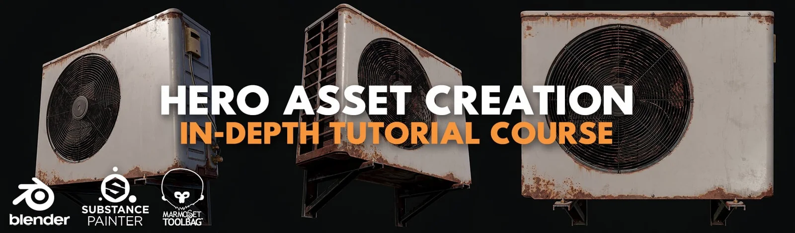 The course utilizes Blender for low-poly and high-poly modeling, cable creation, UV unwrapping, and scene preparation. It then explores ZBrush for boolean cleanup, Marmoset Toolbag for texture baking and final rendering, and Substance Painter for painting normal details and finishing the materials.