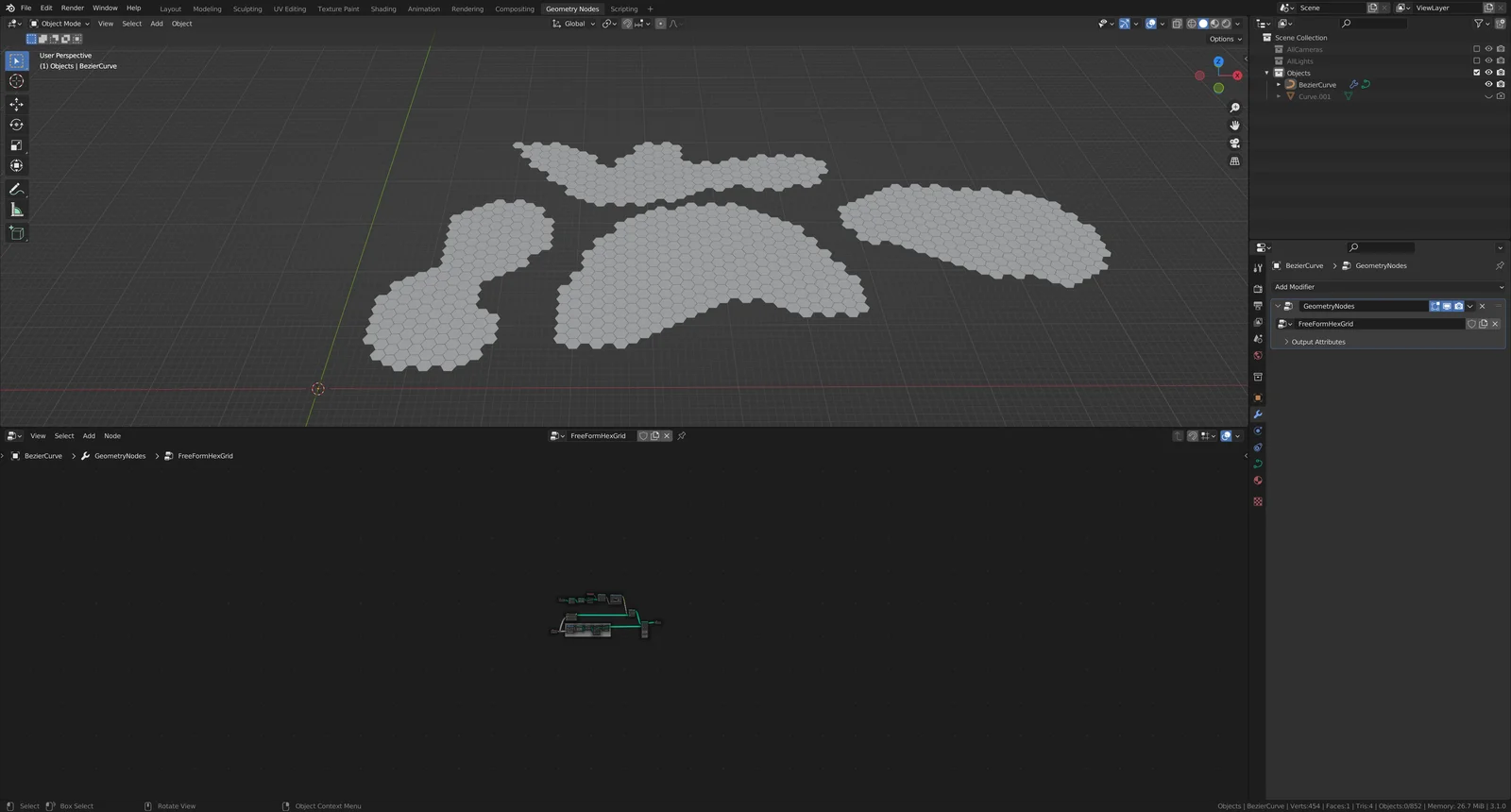 A Geometry Nodes setup that automatically generates a hexagonal grid within any hand-drawn curve shape. Users can switch to top view and use curve tools to define custom boundaries, and the node tree will dynamically fill the area with a hex grid.