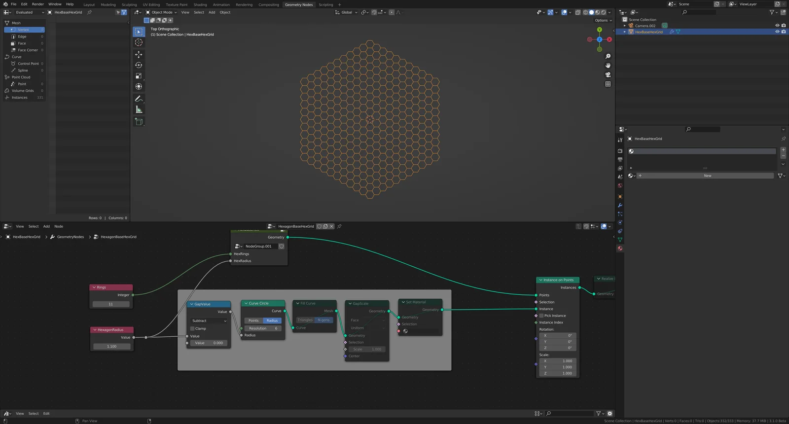 This Geometry Nodes setup generates procedural hexagonal grids arranged on a hexagonal base. Users can easily control the size of individual hexagons, adjust the total number of rings, and tweak the spacing between cells using value or scale-based gap settings.