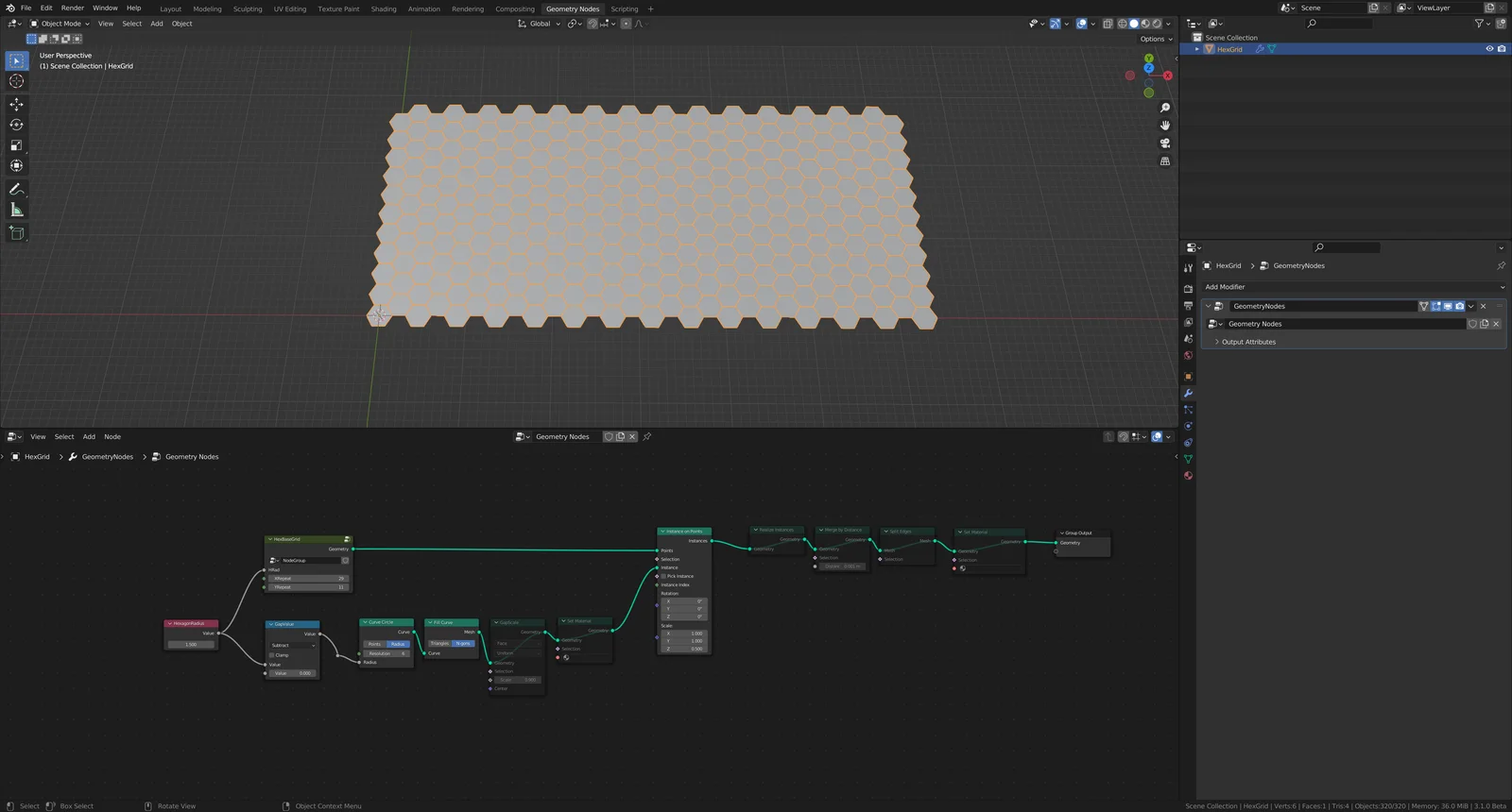Hexagon Grid is a Geometry Nodes setup for generating customizable hexagonal patterns on a rectangular base. By default, the node group outputs a curve grid, but users can enable a fill curve node to convert the output into mesh instances.