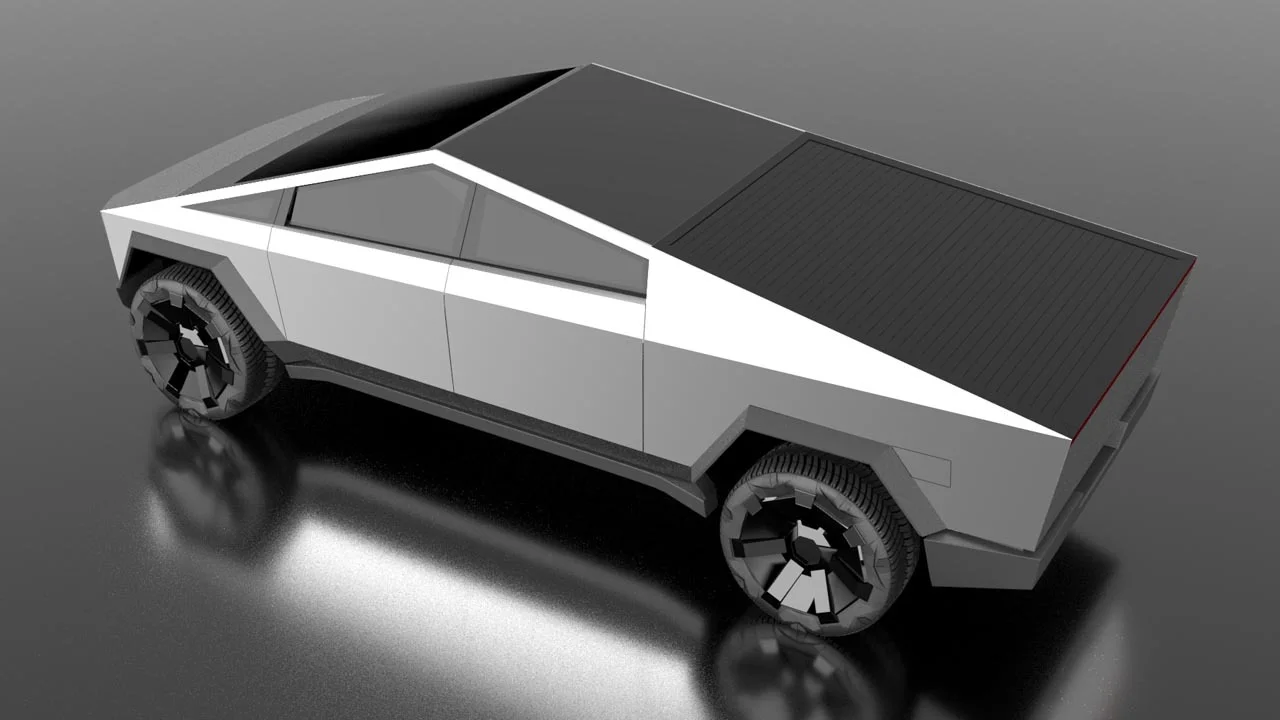 A high-poly 3D model of the Tesla Cybertruck. This asset relies entirely on modeled geometry for its surface features. Elements such as tire treads and mesh grilles are built directly into the mesh rather than being represented by texture maps.