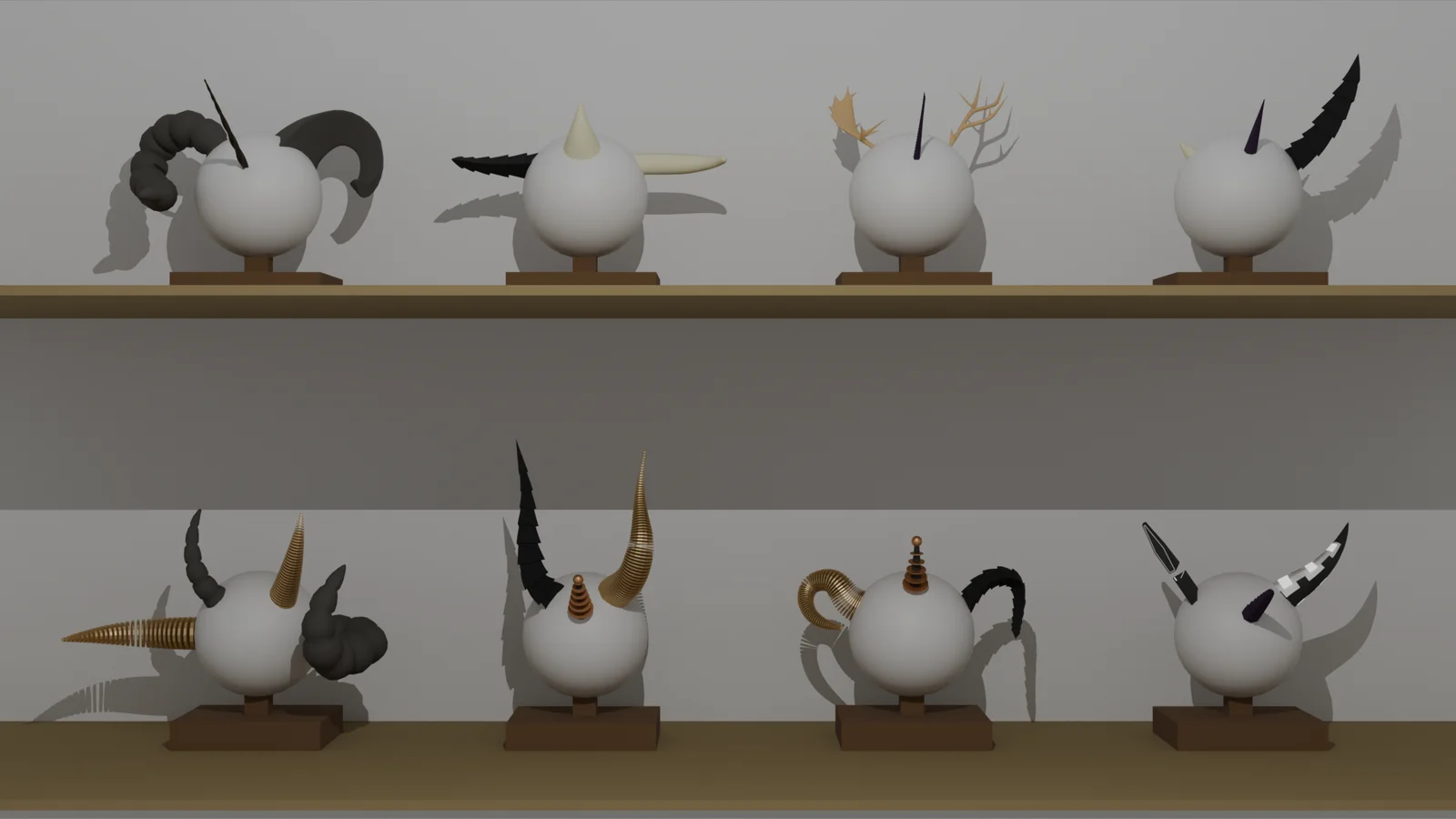 All meshes in the collection are fully UV mapped. While the organic horns are untextured, the two included cyborg horn variants come with dedicated textures, featuring an emission mask that allows the glow color to be easily hue-shifted. The included designs span a wide variety of styles, ranging from natural shapes like deer, moose, rhino, and goat, to fantasy unicorn styles and mechanical tesla coil variants.